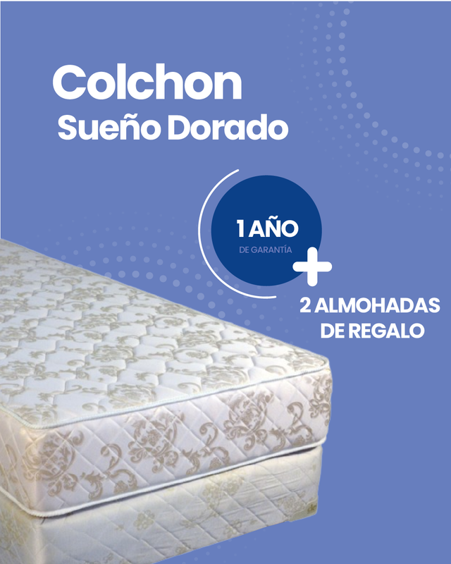 Sueño Dorado de 2 plazas, en medidas 140x190x23 cm, ofrece una solución de descanso económica y de alta densidad. El colchón está compuesto por un núcleo firme de espuma de alta densidad, flanqueado por capas de espuma soft, permitiendo su uso por ambos lados para maximizar su vida útil. La tela jackard resistente asegura durabilidad y confort. La base sommier incluye patas altas de 15 cm, facilitando la limpieza debajo de la cama, y una pata central que aporta mayor resistencia a los movimientos durante el sueño